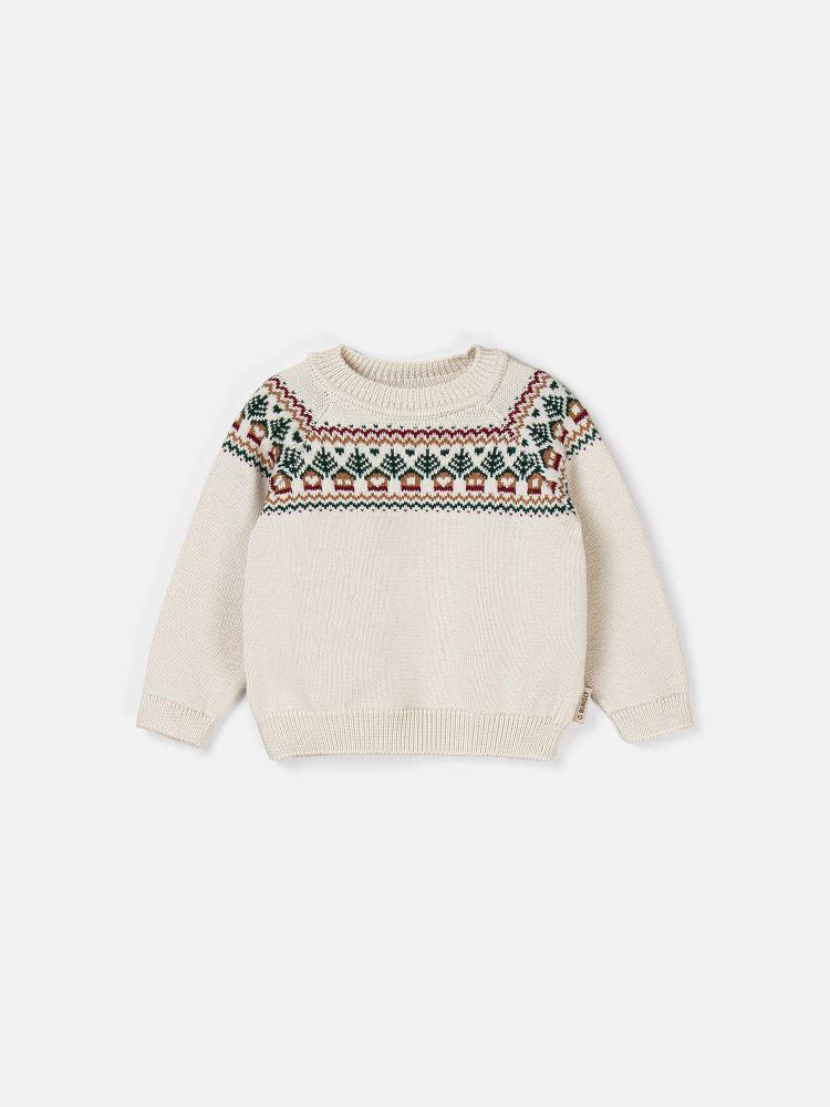 Верх джемпера украшен атмосферным жаккардовым рисунком, а низ выполнен гладкой вязкой для комфорта и аккуратности.