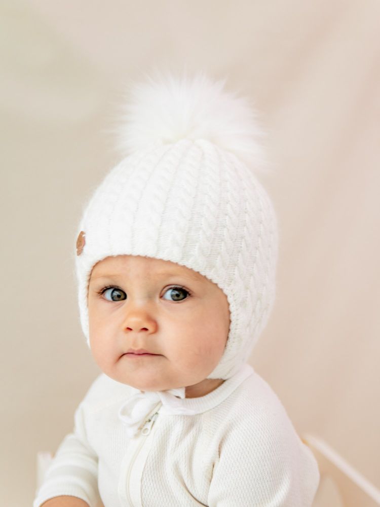 Шапка надежно фиксируется на голове малыша с помощью завязок.
