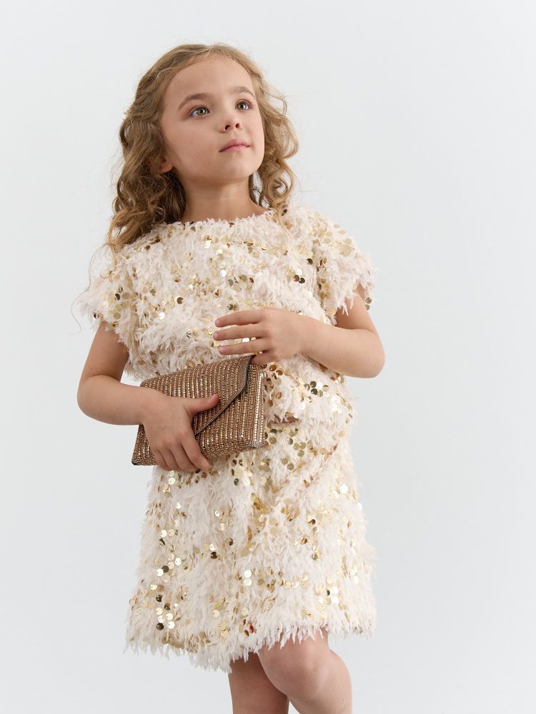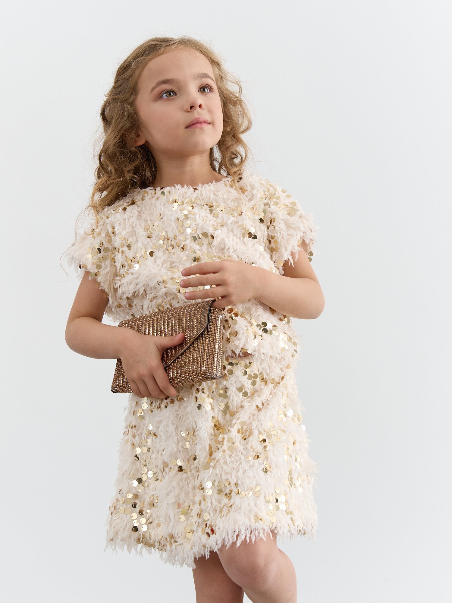 Сверкающие пайетки и искуственные перья делают это платье идеальным выбором на праздник или фотосессию.