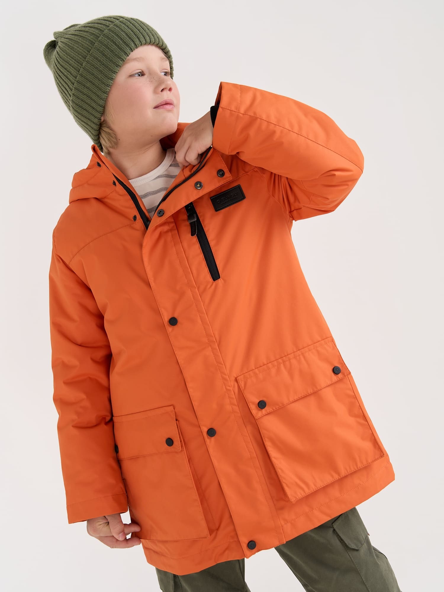 Вместительные карманы-портфели с клапанами на кнопках и один прорезной карман на молнии в верхней части парки.