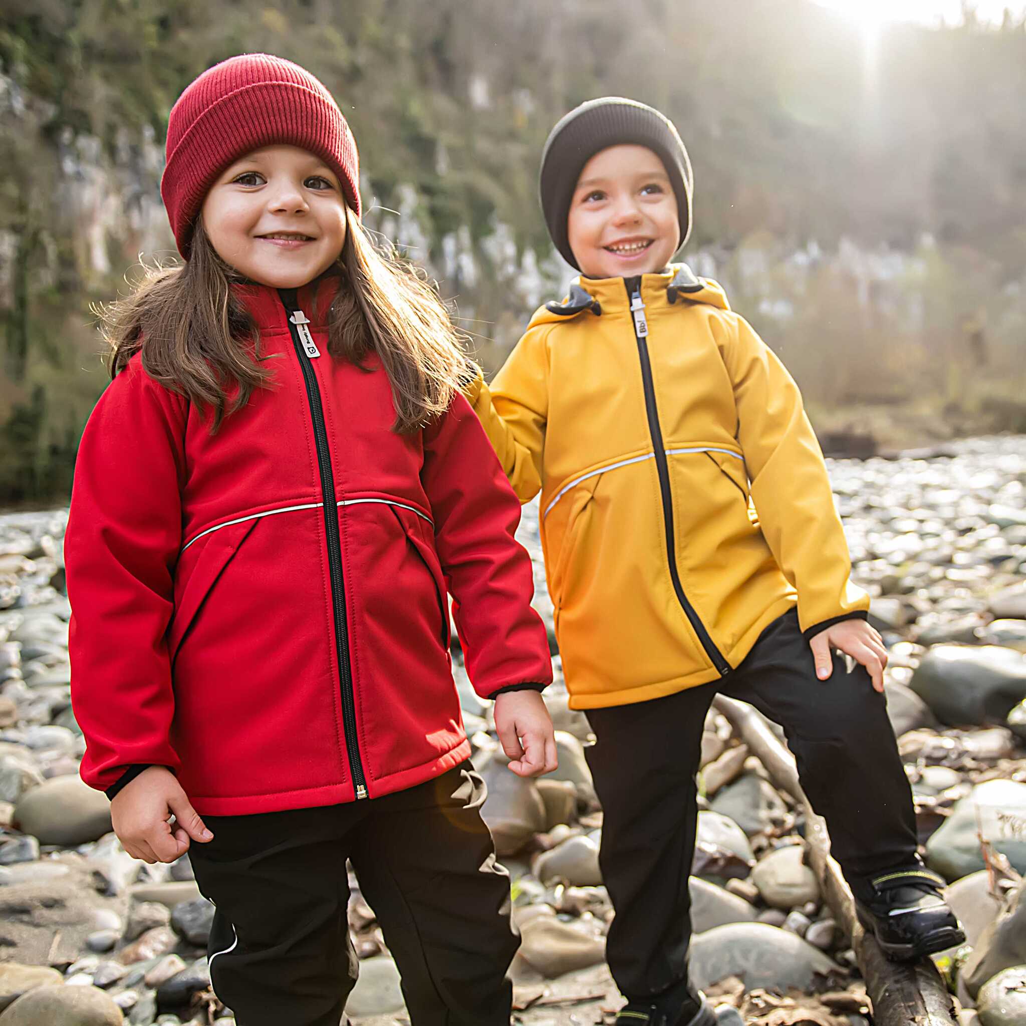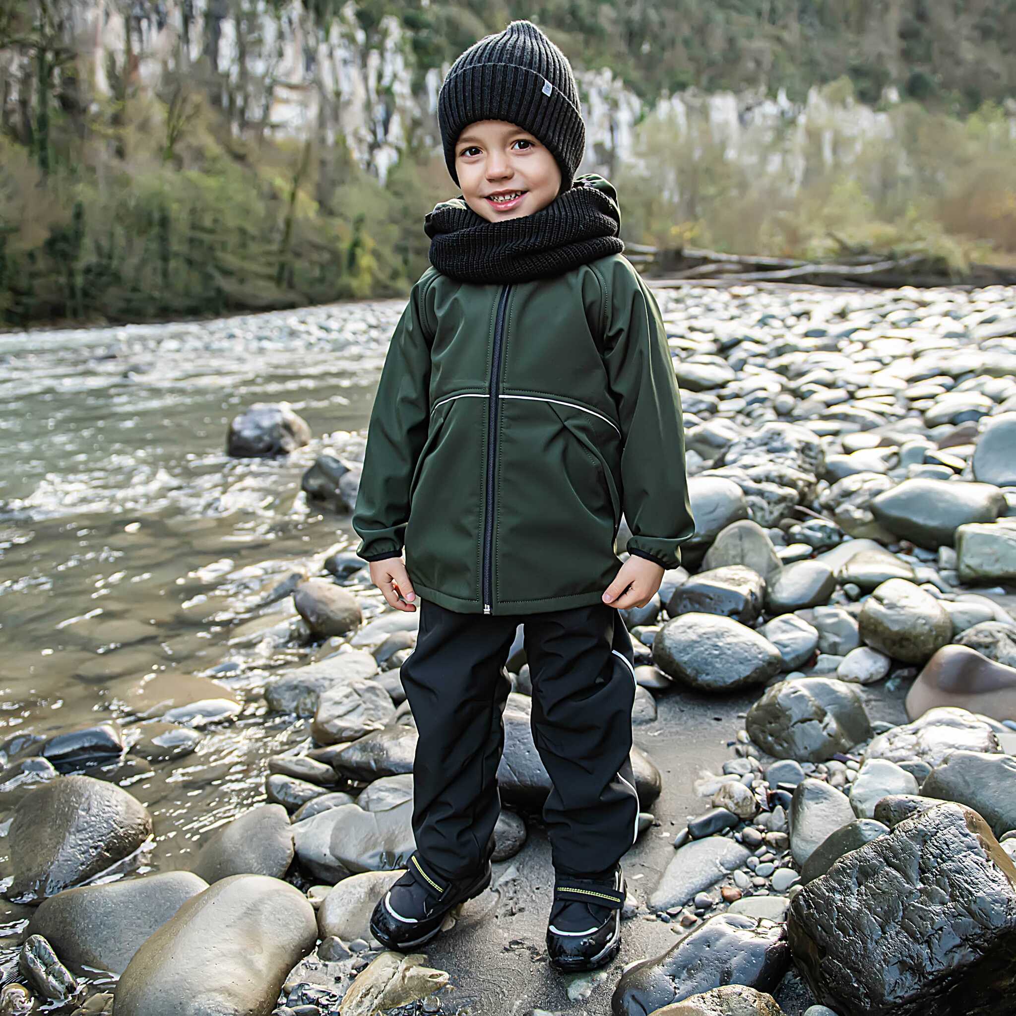 Мембранная ткань софтшелл с показателями 10000/10000 обеспечивает надежную защиту от влаги и продувания, позволяя детям активно проводить время на улице в любую погоду: не промокает даже после прыжков по лужам, а грязь легко смывается.